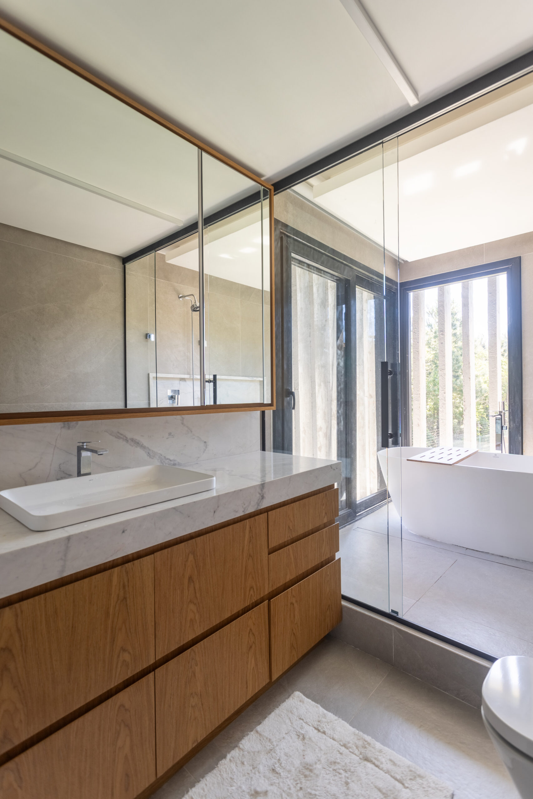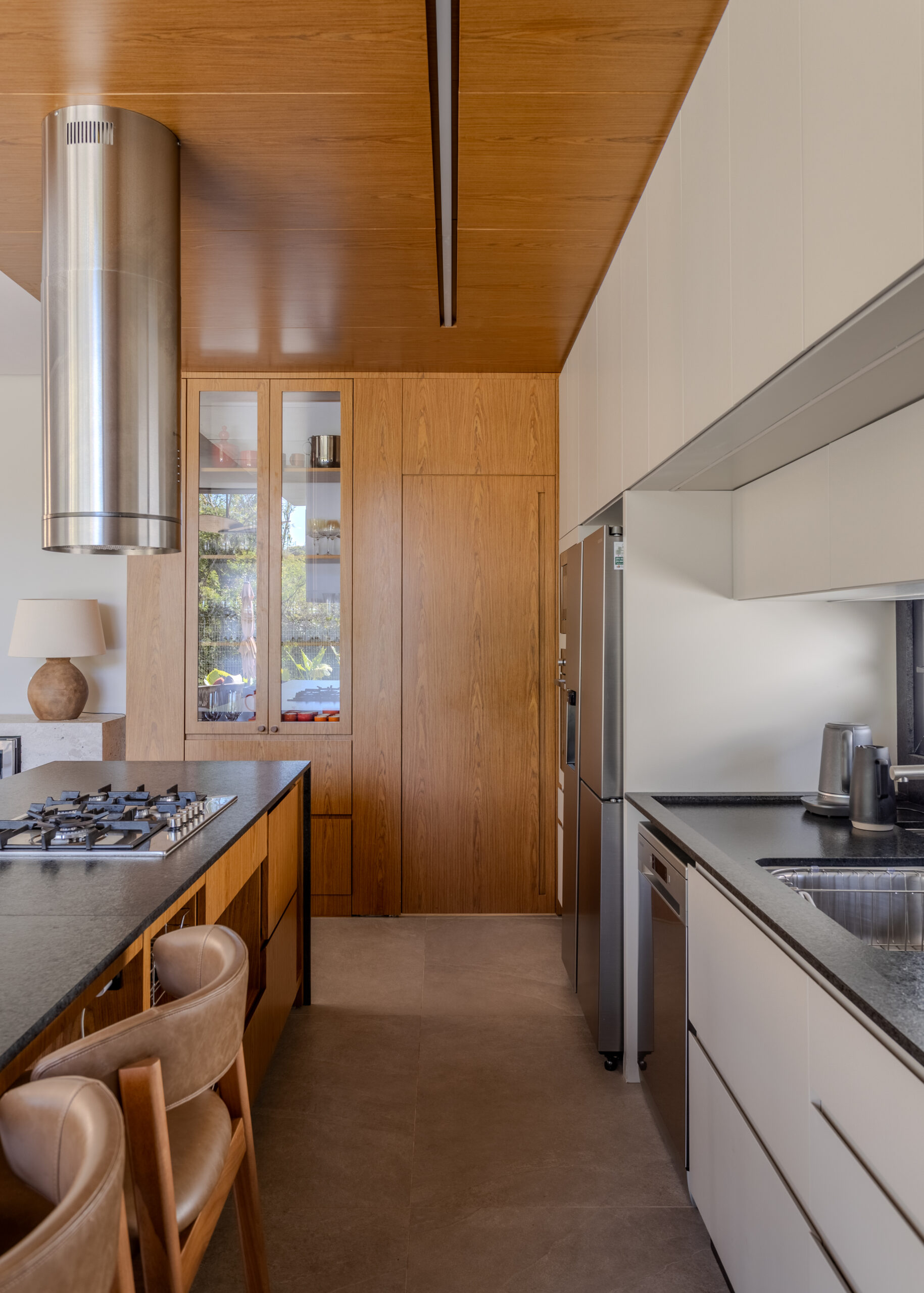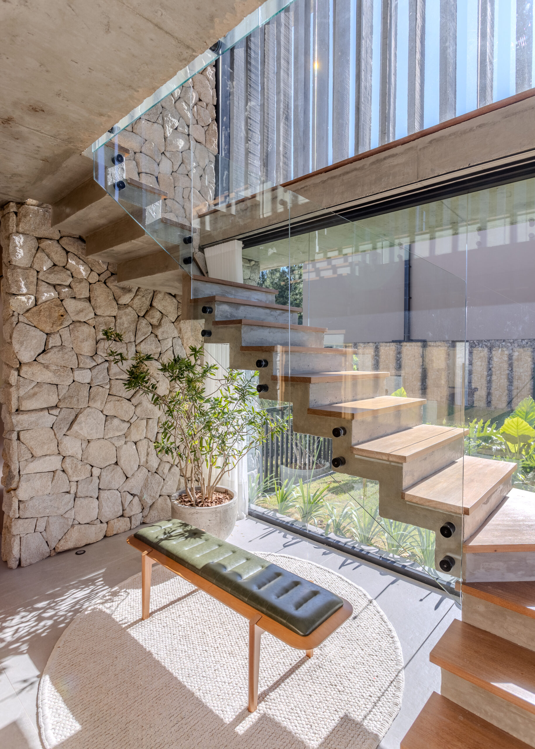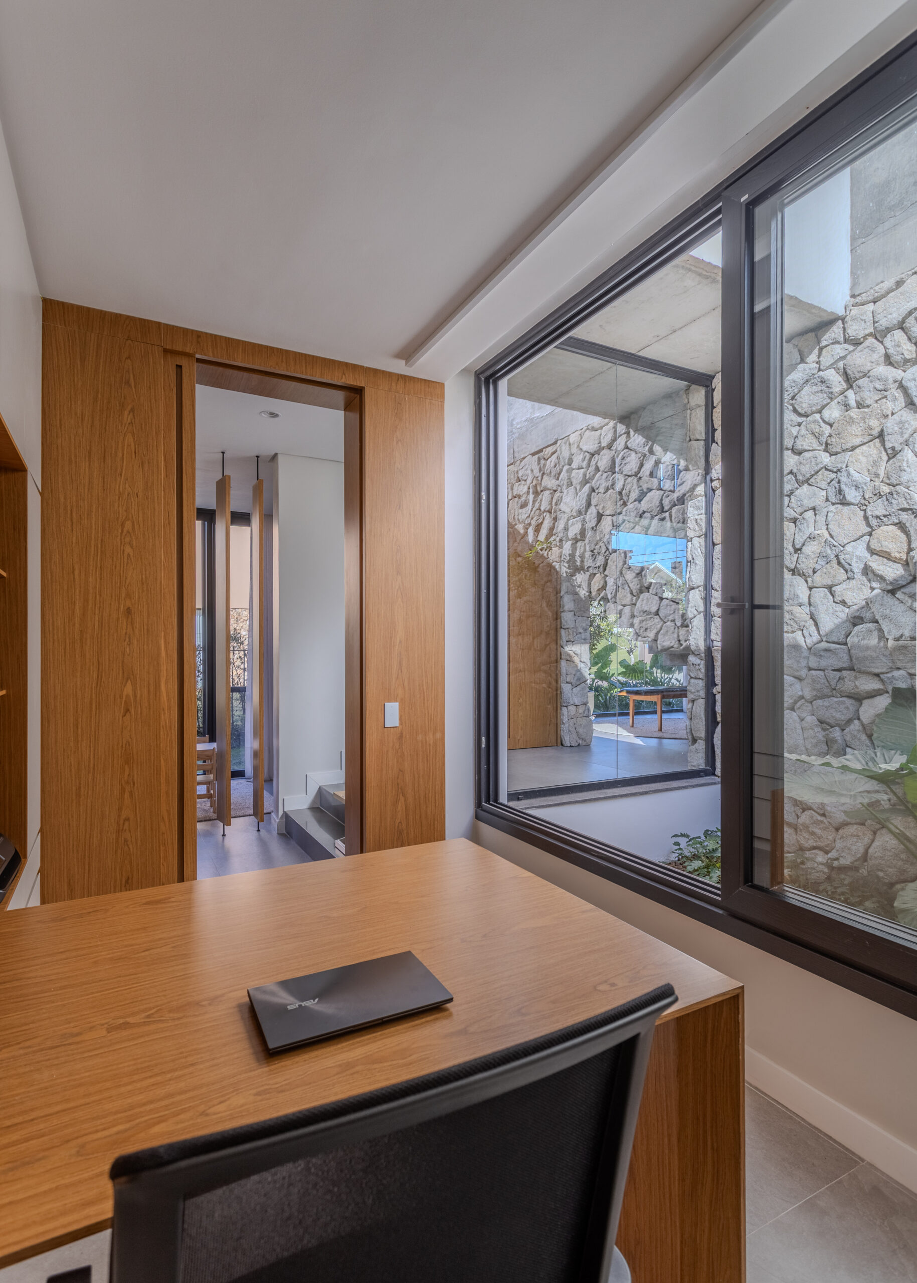No pavimento térreo, a residência se distribui em dois níveis e acomoda-se à topografia do terreno, voltando suas principais visuais para os fundos e lateral leste, tirando partido da orientação solar, bem como, por serem áreas comuns do condomínio, da ausência de vizinhos.