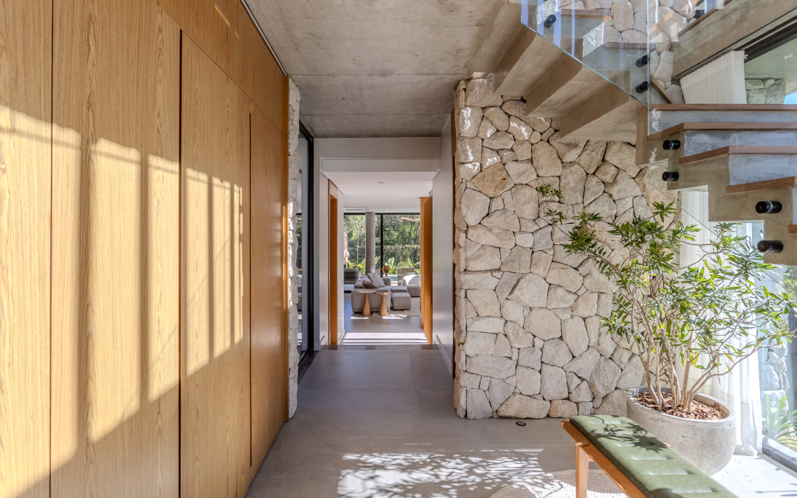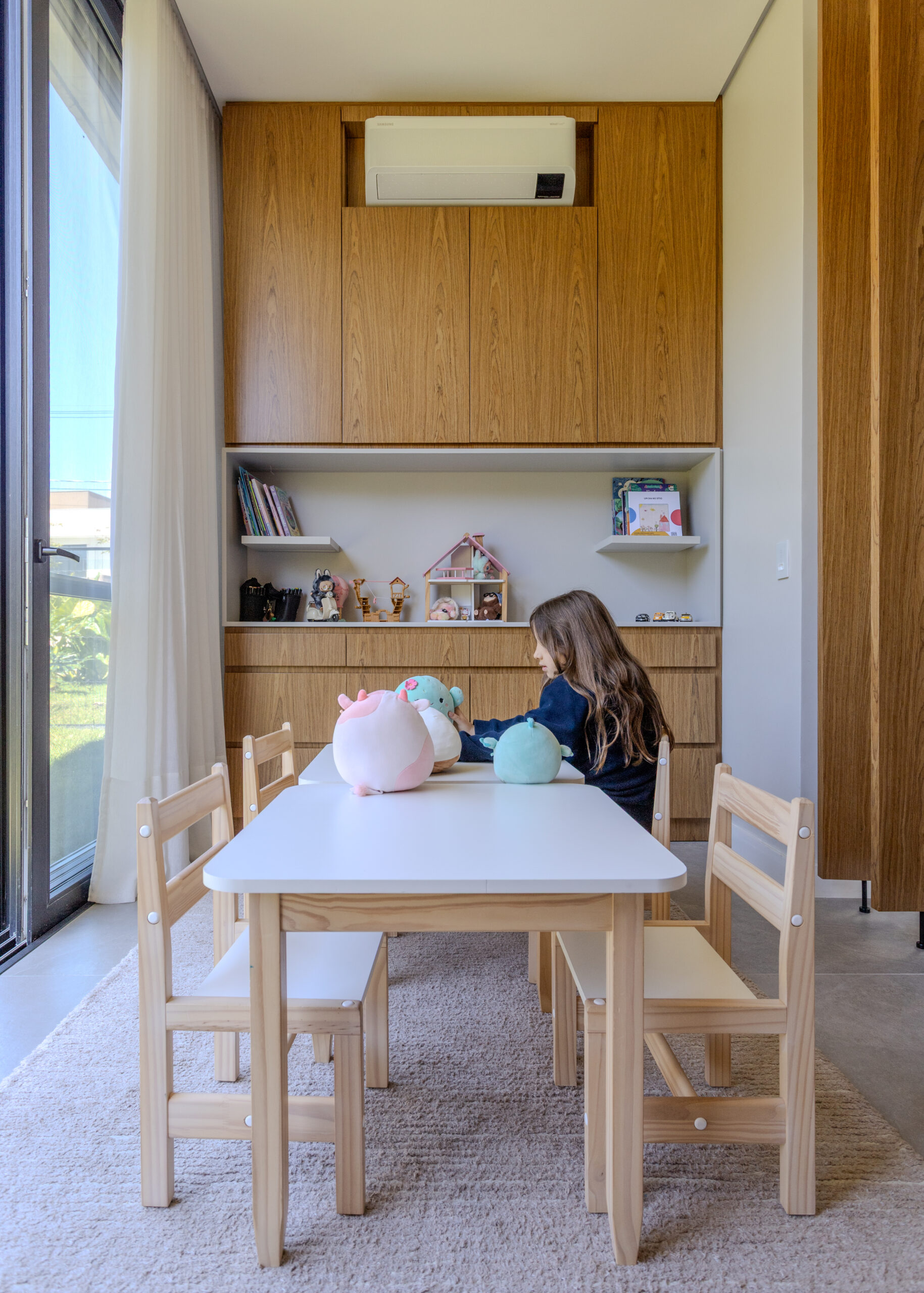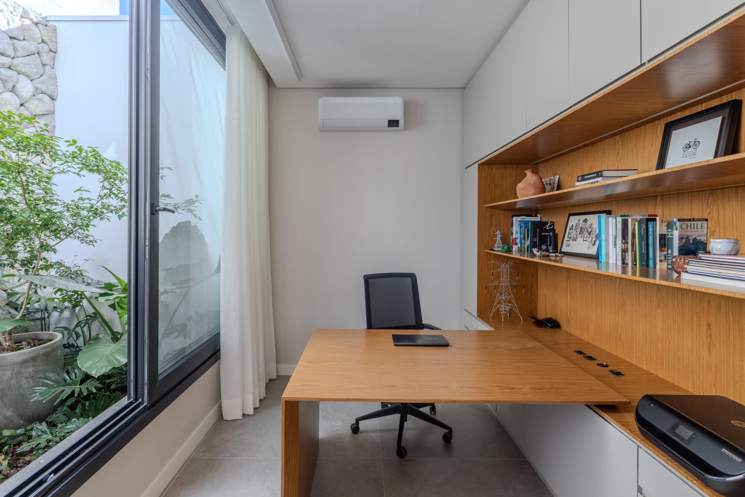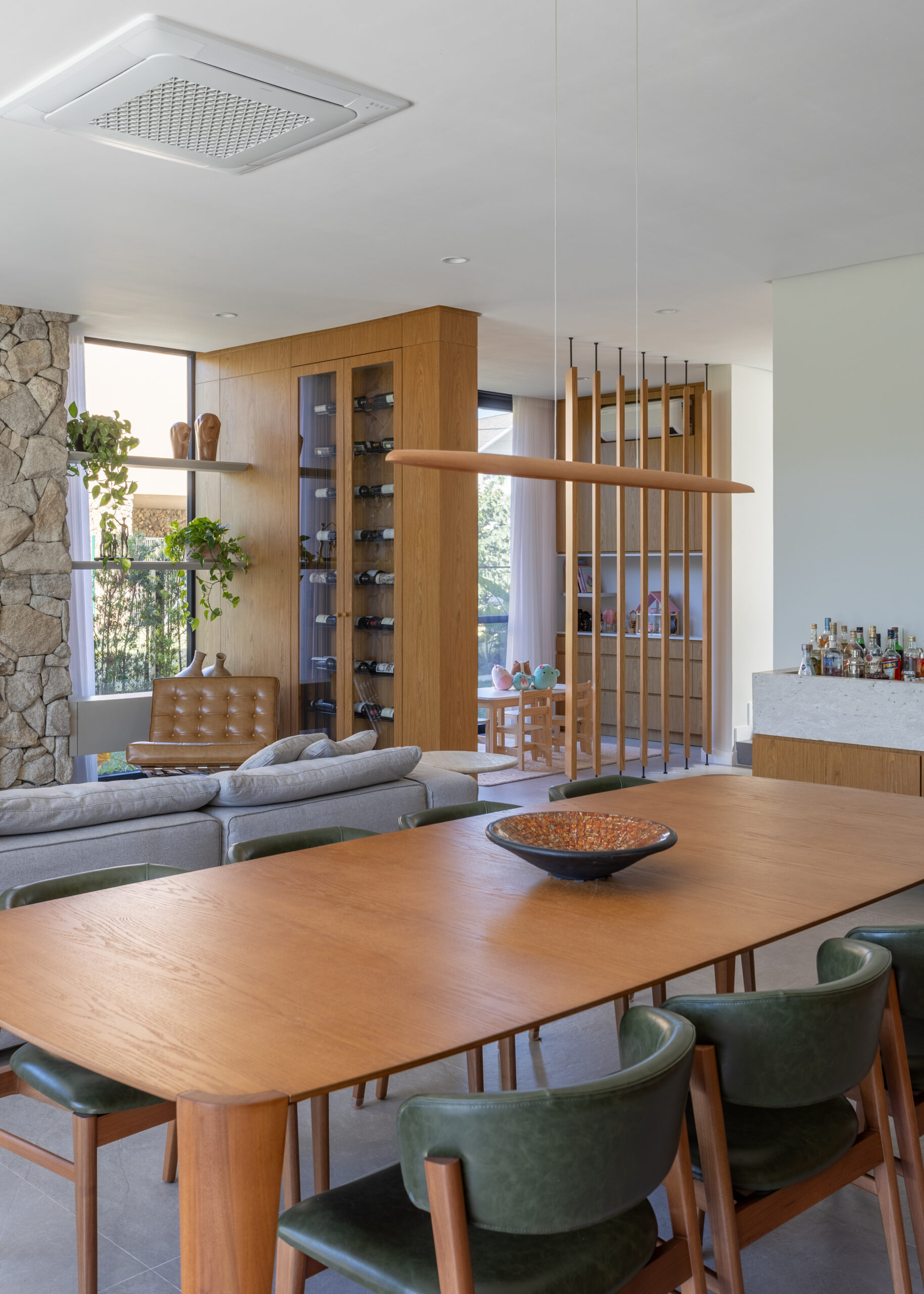No pavimento térreo, a residência se distribui em dois níveis e acomoda-se à topografia do terreno, voltando suas principais visuais para os fundos e lateral leste, tirando partido da orientação solar, bem como, por serem áreas comuns do condomínio, da ausência de vizinhos.