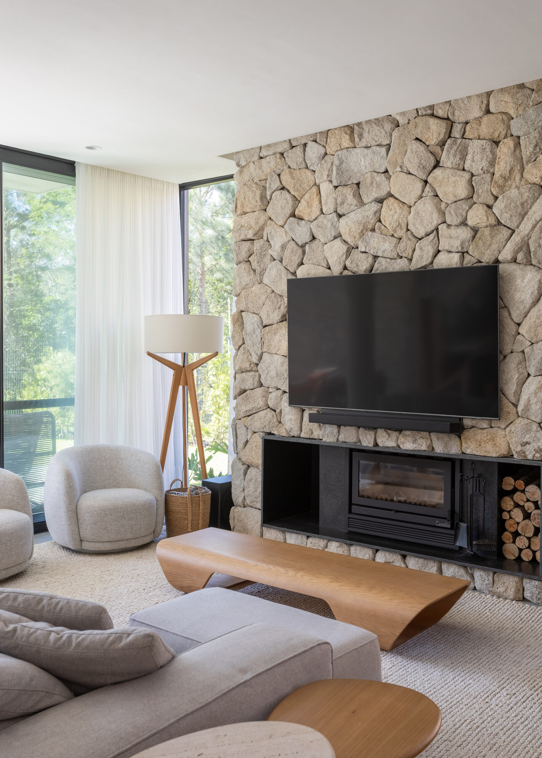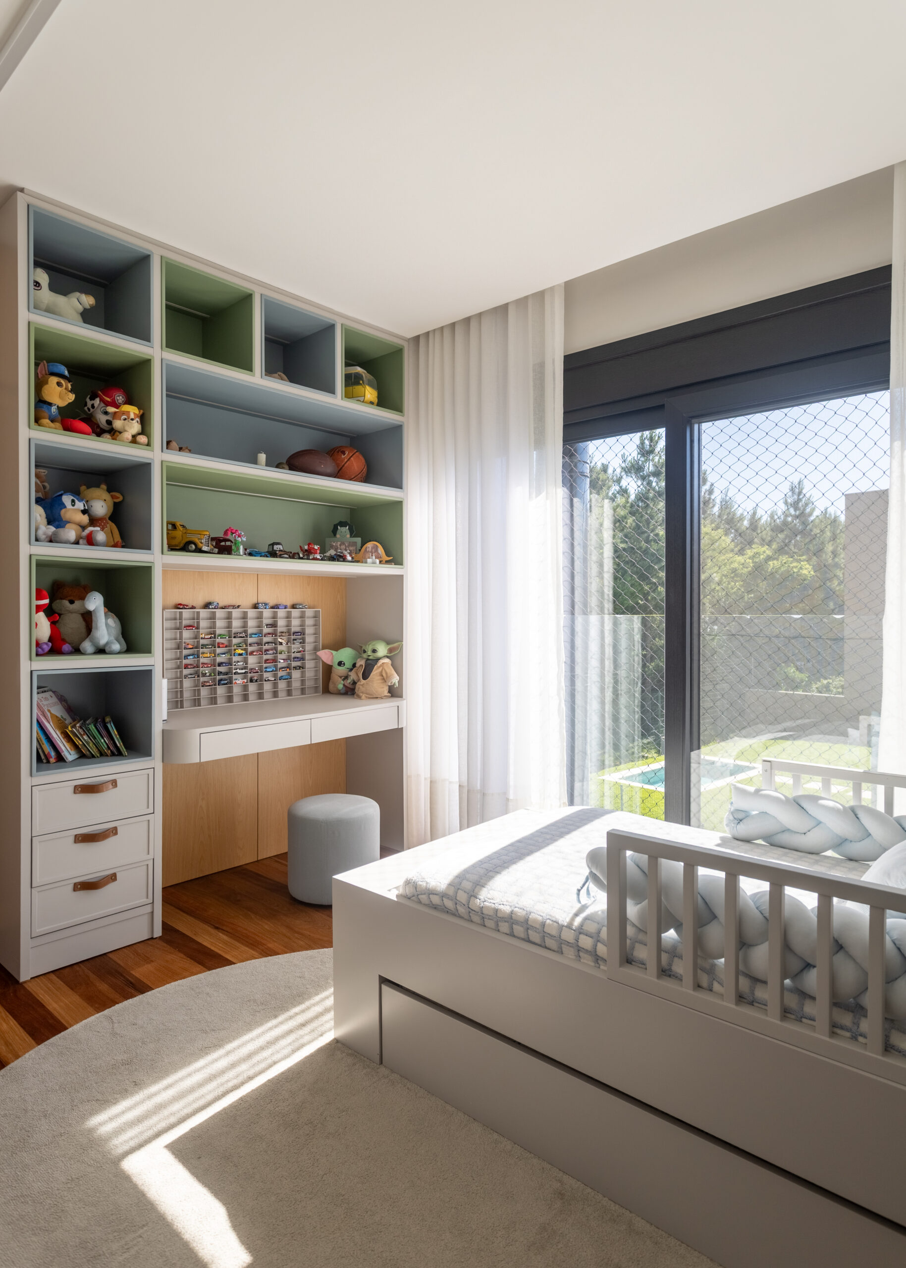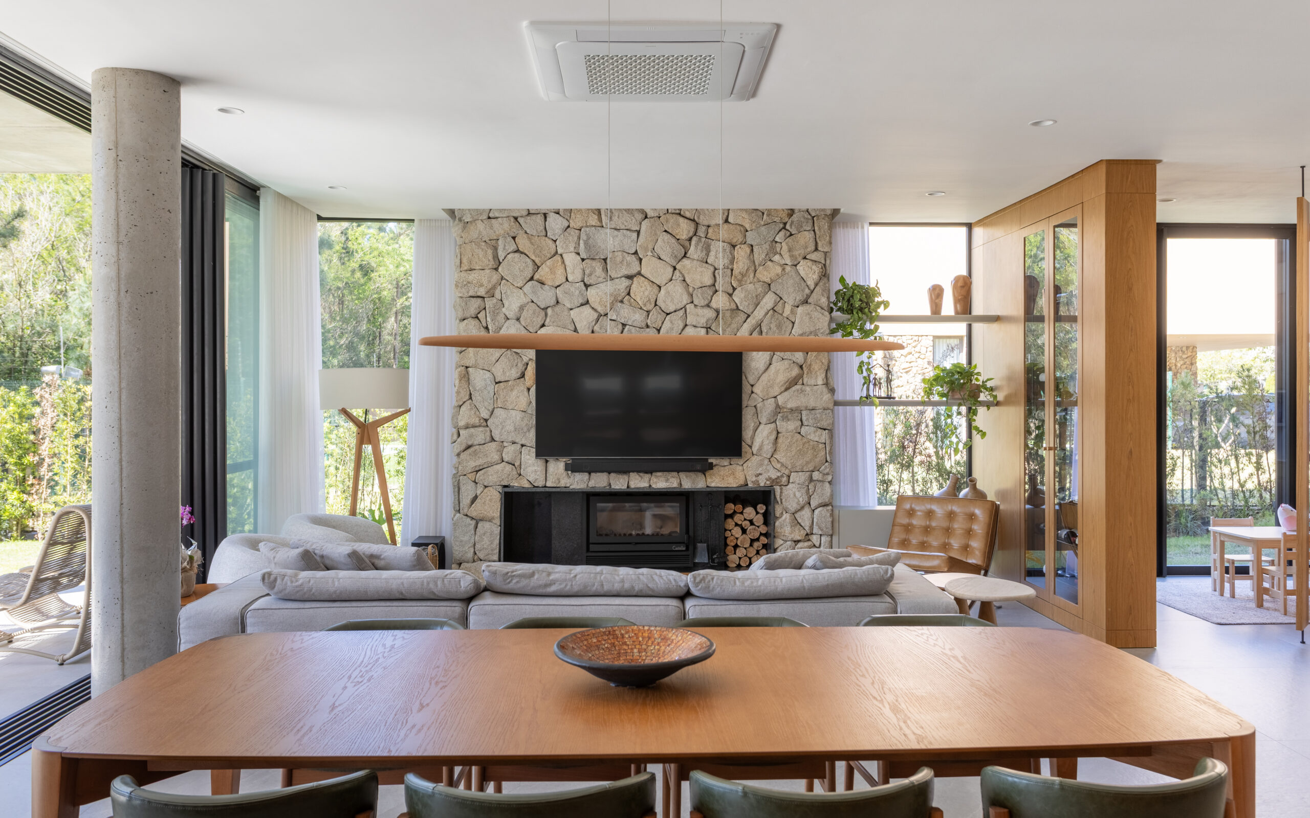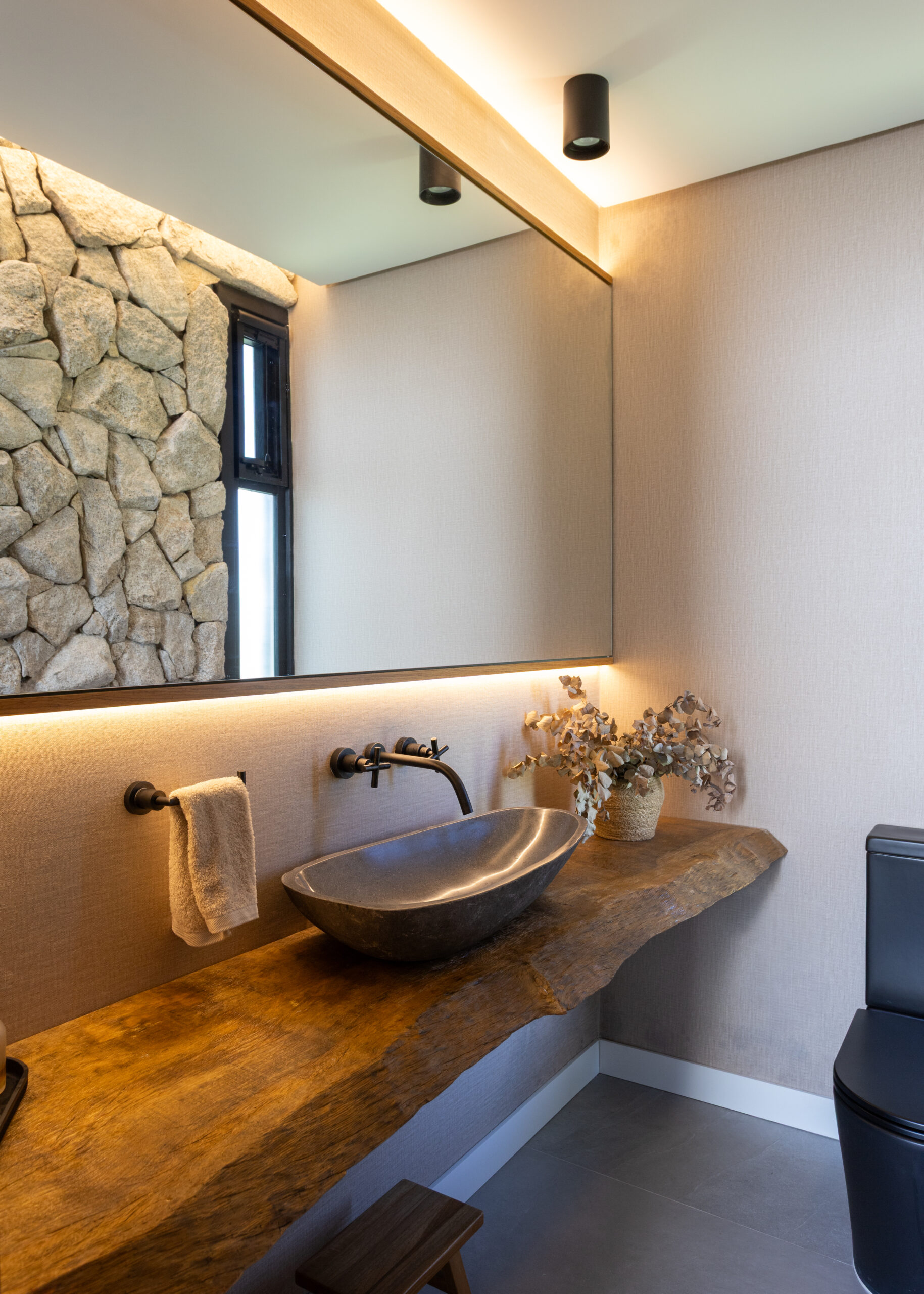 No pavimento térreo, a residência se distribui em dois níveis e acomoda-se à topografia do terreno, voltando suas principais visuais para os fundos e lateral leste, tirando partido da orientação solar, bem como, por serem áreas comuns do condomínio, da ausência de vizinhos.